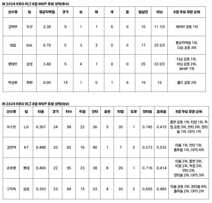 ▲ 2024 신한 SOL뱅크 KBO 리그 8월 월간 MVP 후보 성적 |