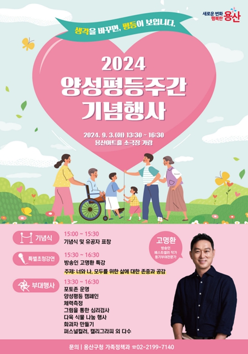 [뉴스서울] 서울 용산구가 양성평등주간(9월 1~7일)을 맞아 오는 3일 오후 3시 용산아트홀(녹사평대로 150) 소극장 가람에서 기념식을 개최한다. 양성평등을 넘어 ‘모두를 위한 존중과 공감’이라는 평등의 의미를 확산하기 위한 자리다.