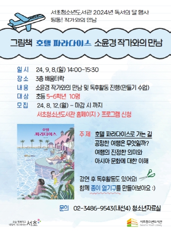 강연 프로그램인 ‘띵동! 작가와의 만남’에서는 그림책 '호텔 파라다이스'의 소윤경 작가가 준비하고 있다. '호텔 파라다이스'를 비롯한 '수연', 'Combi 콤비', '내가 기르던 떡붕이' 등 다수의 저서를 출간한 소윤경 작가와 함께 여행의 진정한 의미와 아시아 문화에 관한 이야기를 나누며 특별한 독후활동이 될 예정이다. 초등학교 고학년(5~6학년)을 대상으로, 오는 8일 오후 2시에 진행된다.