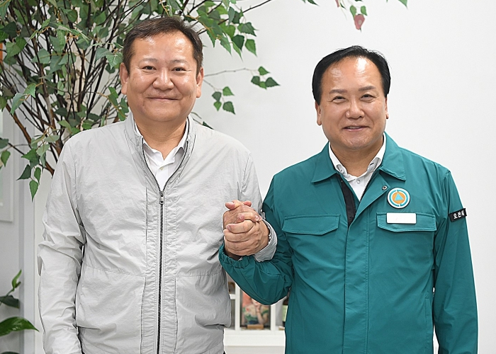 ▲ 이권재 오산시장이 지난해 9월 이상민 행정안전부 장관을 만나 재난안전 및 생활환경 개선을 위한 주요 사업 필요성에 대해 설명하는 모습. |