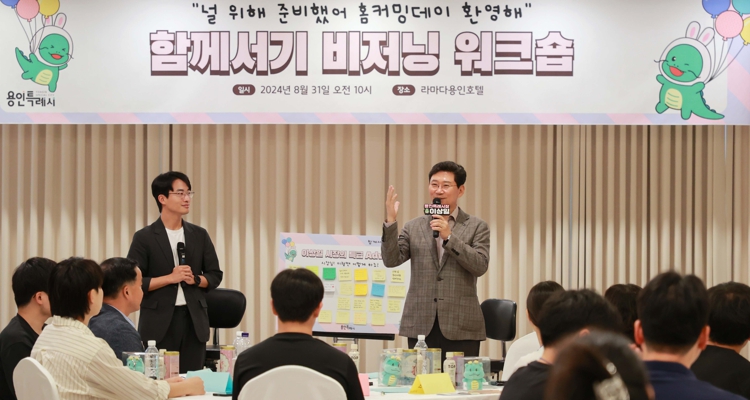 ▲ 이상일 용인특례시장은 31일 처인구 포곡읍 라마다호텔에서 열린 ‘함께 서기 비저닝(Visioning) 워크숍’에 참석해 자립준비청년들을 격려하고 미니 토크쇼를 하며 대화를 나눴다. |