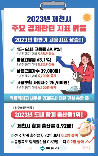 [뉴스서울] 충북 제천시가 최근 통계청에서 발표한 2023년 하반기 지역별 고용조사에서 고용률, 여성고용률, 상용근로자 수, 고용보험가입 인원 등 고용 지표와 출생률 국세징수액이 증가하는 등 경제 관련 지표가 꾸준히 상승하고 있다고 밝혔다.