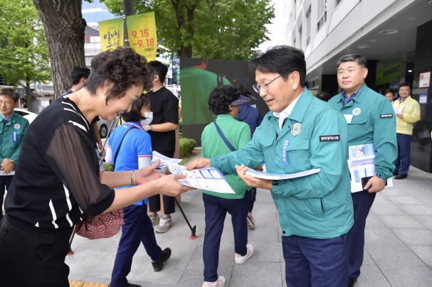 ▲ 강기정 광주광역시장이 지난해 8월23일 동구 전일빌딩245 일대에서 진행된 ‘2023 을지연습 민방공 대피훈련’에 참석해 시민들에게 국민행동요령 유인물을 나눠주고 있다 |