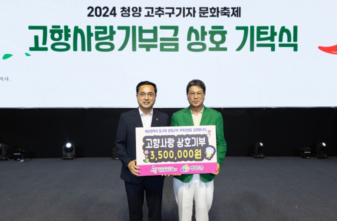 [뉴스서울] 청양군은 지난 8월 30일 고추․구기자문화축제 개막식에서 김돈곤 청양군수와 박희조 대전 동구청장이 고향사랑 상호기부(3백5십만원) 기탁식 및 응원메시지를 전달하는 행사를 가졌다고 밝혔다.