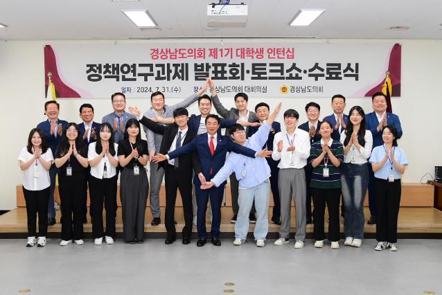경남도의회 입법담당관실은 인턴십 사업 최종일인 31일 오후 도의회 대회의실에서 대학생 인턴의 정책연구과제 발표회와 의원-인턴간 토크 간담회, 그리고 수료식을 순차적으로 실시했다.