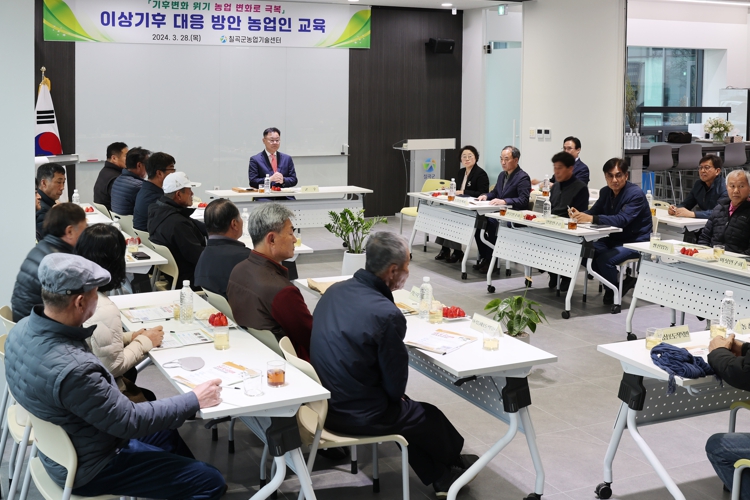 [뉴스서울] 칠곡군은 지난 28일 농업기술센터에서 김재욱 군수를 비롯해 식량·원예·축산 품목별연구회 회장 및 사무국장, 작목반장 등 40여 명이 참석한 가운데 ‘이상기후 대응 방안 농업인 교육’을 실시했다.