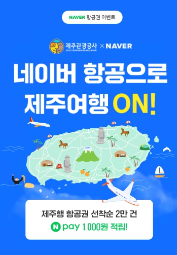 해당 이벤트는 네이버 항공권을 통해 제주행 항공권을 구매하고 탑승을 완료하면 네이버페이 포인트 1,000원이 적립된다.