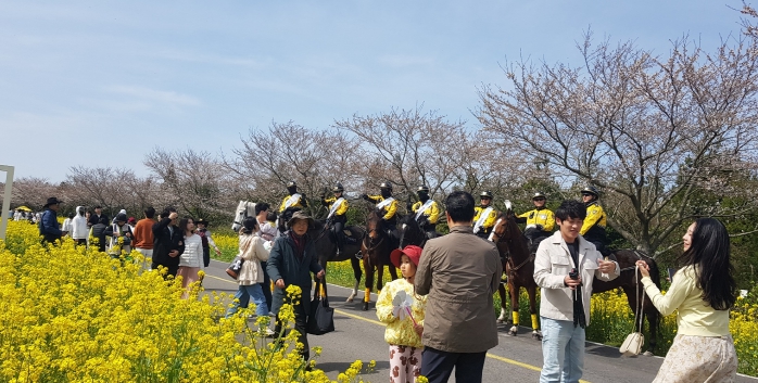 자치경찰단 기마대는 서귀포유채꽃축제 행사장을 찾은 도민과 관광객들이 가까이에서 말을 접할 수 있도록 안내하고 기념사진 촬영 서비스도 제공했다.