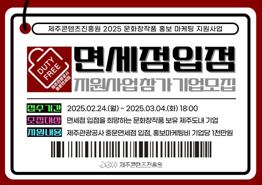 모집대상은 면세점 입점지원을 희망하는 "문화산업" 관련 문화창작품의 법적권리를 가진 제주특별자치도 소재 기업이며, 제주관광공사 중문면세점 입점을 비롯해 홍보마케팅비 최대 1,000만원을 지원한다.