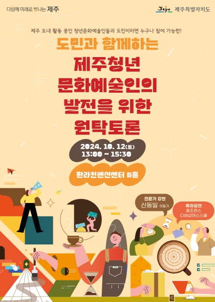 [뉴스서울] 제주특별자치도는 오는 10월 12일 한라컨벤션센터(B홀)에서 제주청년들이 직접 기획한 ‘도민과 함께하는 제주청년문화예술인의 발전을 위한 원탁토론’을 개최한다고 밝혔다.