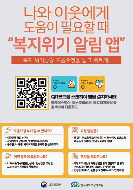 앱은 구글플레이스토어와 애플앱스토어에서 ‘복지 위기 알림’을 검색하거나 휴대전화 카메라로 큐알(QR) 코드를 인식해 설치할 수 있다.