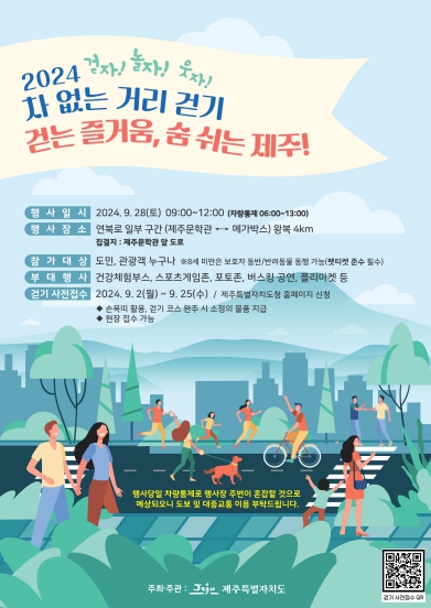 강동원 제주도 안전건강실장은 “이번 차 없는 거리 걷기 행사는 도민의 건강 증진, 환경 보호, 지역 공동체 강화 등 여러 목표를 동시에 추구한다”며 “도민 안전을 최우선으로 하면서 동시에 참가자 모두가 즐겁고 의미 있는 경험을 할 수 있도록 준비에 만전을 기하고 있다”고 말했다.