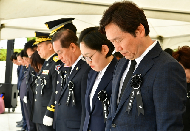 추념식은 오전 10시 정각 전국에서 울리는 사이렌에 맞춰 ▲순국선열 및 호국영령에 대한 추모 묵념 ▲조총 발사 ▲헌화 및 분향 ▲추념사 ▲헌시 낭송 ▲현충일 노래 제창 순으로 경건하게 진행됐다.