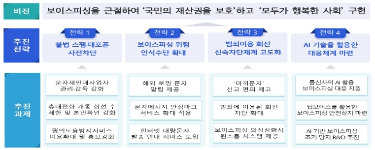 주요내용으로 보이스피싱 범죄 수단으로 활용되는 불법스팸 계정 생성, 대포폰 개통, 명의 도용을 방지하고, 국민들이 보이스피싱 피해를 입지 않도록 인식 수단을 확대하는 한편, 범죄·피해 발생 시 범죄에 이용된 회선 등을 신속히 차단할 수 있도록 하며, AI 기술을 활용한 대응체계를 마련한다.