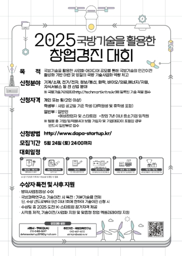 [뉴스서울] 방위사업청은 국방기술의 민간 이전 활성화를 통한 창업지원과 청년 일자리 창출을 위해 개최 예정인'2025 국방기술을 활용한 창업경진 대회'의 참가자를 5월 24일까지 공개모집 한다고 밝혔다.