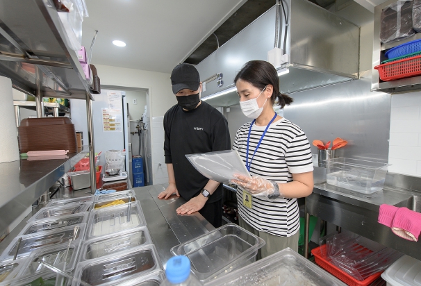 ▲ 양천구 소비자식품위생감시원이 배달음식전문점 위생점검하는 모습 |