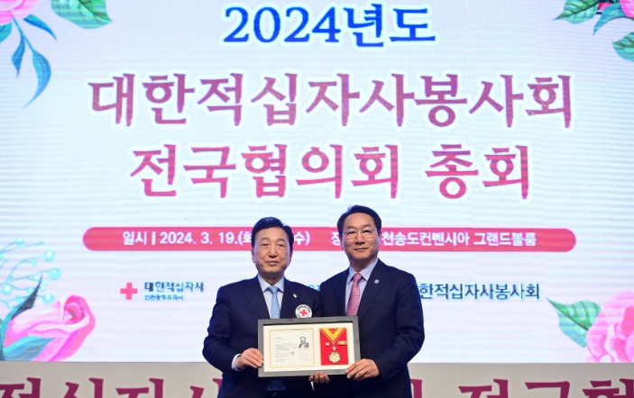 [뉴스서울] 인천광역시는 3월 19일 송도컨벤시아에서 열린 ‘2024년도 대한적십자사 봉사회 전국협의회 총회’에서 적십자회원유공장 명예대장 포장증을 받았다고 밝혔다.