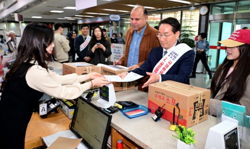 ▲ 유정복 인천광역시장이 24일 남인천우체국에서 인천거주 외국인들과 제1호 아이(i) 글로벌 택배를 발송하고 있다. |