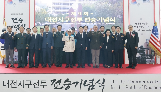 [뉴스서울] 대전시는 11일 시청에서 제9회 대전지구전투 전승기념식을 개최했다. 대전지구전투는 6·25전쟁 당시 미 24사단이 참여해 낙동강 방어선 구축에 결정적 기여를 한 방어 전투로 이날 기념식에는 이장우 대전시장과 미8군 사령관을 비롯해 6·25참전 유공자회 등 보훈단체 회원 350여 명이 참석했다.
