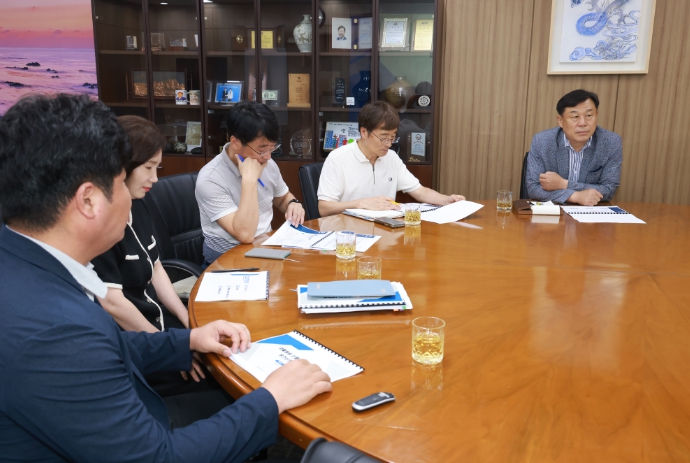 ▲ 동구는 23일 구청장실에서 김종훈 동구청장과 용역업체 및 관계공무원이 참석한 가운데 재활용품 선별처리 대행료 산정을 위한 용역 최종보고회를 가졌다. |