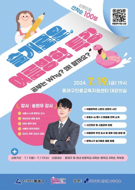 [뉴스서울] 부산 동래구는 오는 19일 오후 7시 동래구진로교육지원센터(동래구 시실로 129, 3층)에서‘슬기로운 여름방학’특강을 개최한다고 밝혔다.