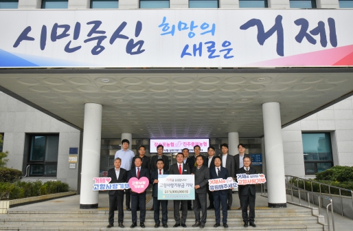 거제시는 27일, 시청에서 장승포농협 이윤행 조합장과 진주 중부농협 심철효 조합장 등 양 지역 농협관계자 10여명이 참석한 가운데 고향사랑기부금 기탁식을 가졌다고 밝혔다.