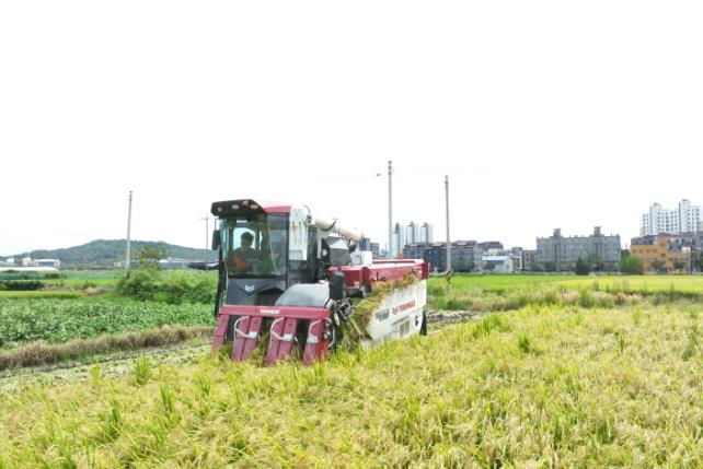 백성현 논산시장은 이 날 현장을 방문해 직접 콤바인을 운전하며 벼 베기 시연을 진행했다.