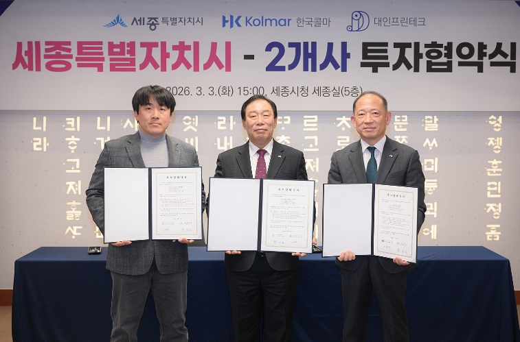 [뉴스서울] 세종특별자치시가 3일 시청 세종실에서 한국콜마㈜, ㈜대인프린테크와 관내 산업단지 내 공장 신설 및 전면 이전을 위한 1,858억 원 규모의 투자협약(MOU)을 체결했다.