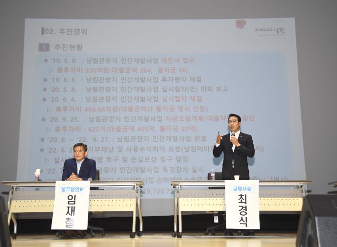 공청회는 조기현 한국지방행정연구원 센터장의 민간개발사업 의미를 알아보고 남원관광지 민간개발사업 경과 및 손해배상 소송 진행 상황을 공유하며 시민의견을 수렴하는 순으로 진행됐다.