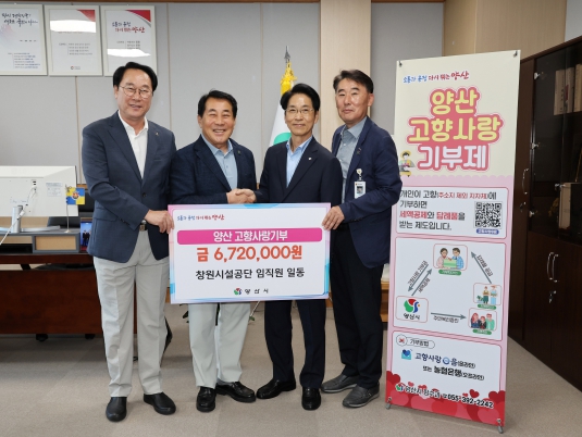 나동연 양산시장은 “양산과 창원이 함께하는 상생발전의 일환으로 두 지역의 발전을 응원하는 마음으로 상호기부에 동참해준 창원시설공단 임직원분께 진심으로 감사드린다”며 “이번 상호기부가 양산과 창원 간 우호 증진과 다양한 분야에서의 지속적인 교류로 이어지길 바란다”고 말했다.