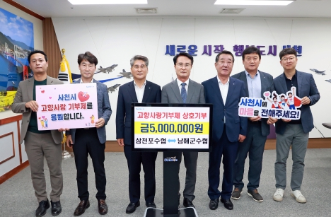 이날 김철범 남해군수협조합장, 정도근 삼천포수협조합장 등 관계자 6명이 사천시청을 방문해 고향사랑기부금을 전달했다.
