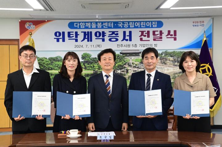 [뉴스서울] 진주시는 11일 시청 기업인의 방에서 다함께돌봄센터 2개소 및 국공립어린이집 2개소 수탁운영자와 위탁계약증서 전달식을 가졌다.