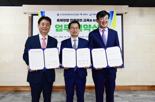 최문순 군수, 문영훈 국가 민방위 재난안전교육원장, 김성 장흥군수는 이날 협약에서 지역축제 안전 증진을 위해 현장 안전관리 대책 컨설팅 교육, 인명사고 대비 심폐소생술 등 체험교육 등에 함께 힘을 모으기로 했다.