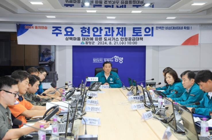 [뉴스서울] 함양군은 21일 오전 10시 군청 재난종합상황실에서 진병영 군수 주재로 관계 공무원을 비롯해 소방서, 경찰서, 도시가스, 한전, KT 등 20여 명이 참석한 가운데 2024 을지연습 전시현안과제 토의 훈련을 개최했다.