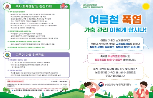 또한 집중호우 및 폭염 대비 재해피해 최소화를 위한 여름철 농업인 안전재해예방 행동 요령과 가축관리 요령을 담은 리플렛을 제작해 배포한다. 이와 함께 사회관계망서비스, 문자통보 시스템을 활용해 축산농가를 대상으로 적극적으로 홍보할 계획이다.