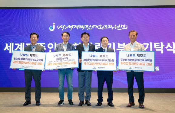 기탁식에는 허능필 세계제주인대회조직위원회 공동위원장을 비롯해 김대현 부산제주도민회 회장, 고동범 인천제주특별자치도민회 회장, 김대권 경남제주특별자치도민회 회장이 참여했다.