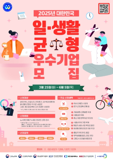 [뉴스서울] 고용노동부는 산업통상자원부, 중소벤처기업부, 한국경영자총협회, 대한상공회의소, 중소기업중앙회와 함께 「대한민국 일・생활 균형 우수기업」을 3월 25일부터 모집한다고 밝혔다.