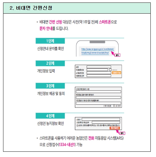 금년의 경우 신청 편의성 제고를 위해 스마트폰 등을 이용한 비대면 신청기한을 1개월에서 3개월로 확대했다. 신청일 기준으로 농업경영체 등록정보가 지난해와 변동이 없는 농업인은 비대면 간편신청이 가능하며, 별도의 서류 제출 없이 스마트폰이나 전화자동응답시스템(ARS)를 이용해 신청이 가능하다. 이들에게는 문자메시지(SMS) 등을 통해 3월 3일부터 신청을 안내할 예정이다. 또한, 간편신청이 불가한 농업인·법인은 인터넷에 접속하여 비대면 신청이 가능하도록 신청방식을 추가 도입하여 농업인들이 보다 편리하게 신청할 수 있게 했다.