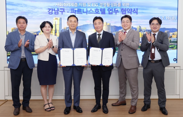 [뉴스서울] 꿈이 모이는 도시, 미래를 그리는 강남구가 19일 구청 본관에서 파르나스호텔과 ‘사회취약계층을 위한 공동사업 및 ESG 경영 활성화 추진 업무협약’을 체결했다.