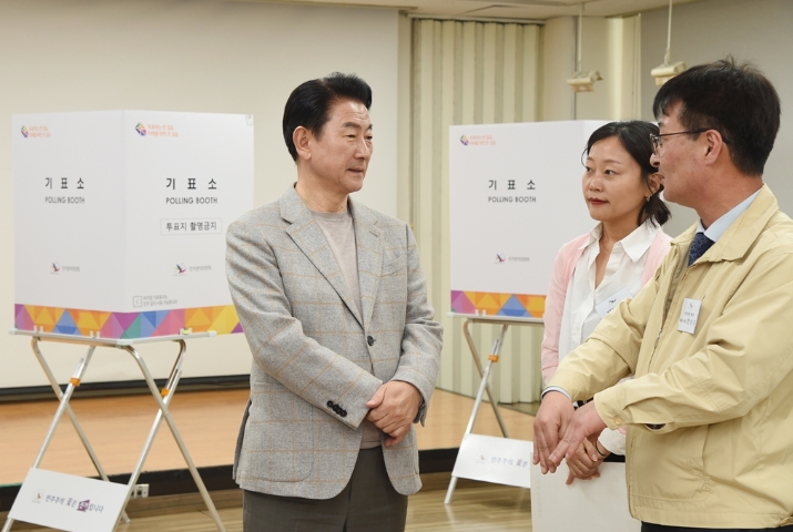 앞서 김동근 시장은 사전투표 전날인 지난 4일에도 송산2동사전투표소를 직접 점검한 바 있다. 이날 최종 점검에서도 투표소 설치 등 준비상황을 꼼꼼히 살피고 선거사무 종사자를 격려했다.