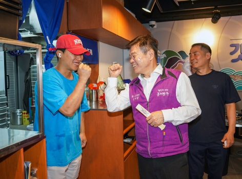 ▲ 임기 3년차 현장소통(현장通通) 중 이필형 구청장이 상인에게 응원의 메시지를 |