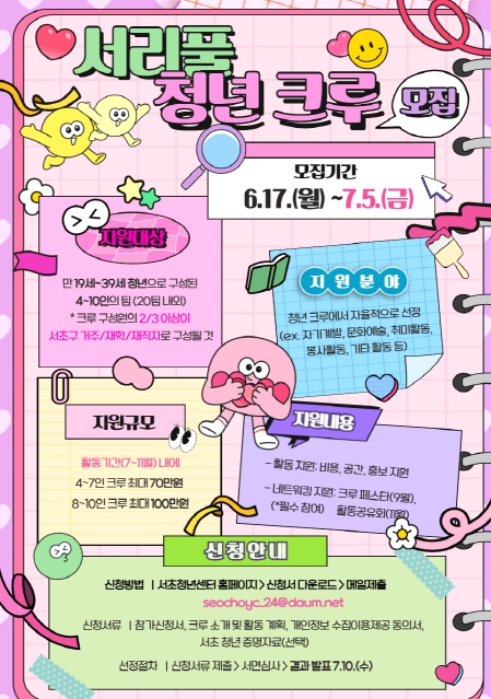 19세~39세의 청년 4~10인으로 크루를 구성하면 되는데, 구성원의 2/3 이상이 서초구에 거주하거나 지역 내 학교, 직장을 다니고 있으면 누구나 신청 가능하다.