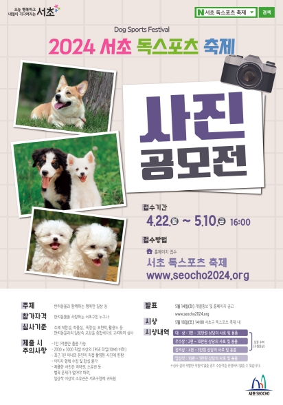 이번 공모전은 5월 18일 개최 예정인 ‘2024 서초 독 스포츠 축제’의 사전 프로그램으로, 반려동물에 대한 관심이 높아짐에 따라 반려동물과의 행복한 일상을 반려인과 비반려인이 함께 공유하기 위해 마련했다.