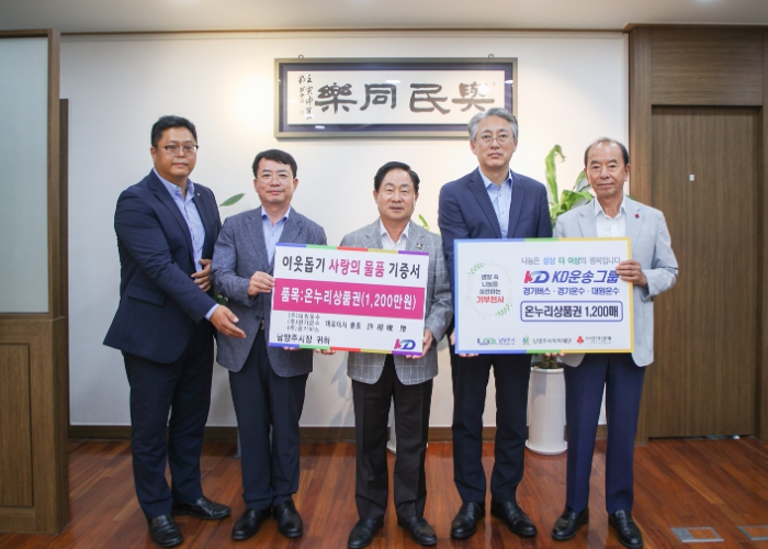 이날 KD운송그룹은 추석을 앞두고 지역의 취약계층을 지원하기 위해 온누리상품권 1,200매(1,200만 원 상당)를 남양주시 복지재단(대표이사 원병일)에 전달했다.