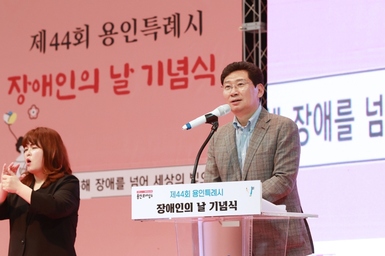 이 시장은 “오늘 이 자리는 장애인과 비장애인 구분 없이 서로 소통하고 존중하면서 용인특례시를 따뜻한 생활 공동체로 만들어 가기 위해 다짐하는 자리”라며 “장애인이 겪고 있는 불편을 덜어주기 위해 지난해보다 예산을 늘려가며 최선을 다해 지원하고 있다”고 말했다.