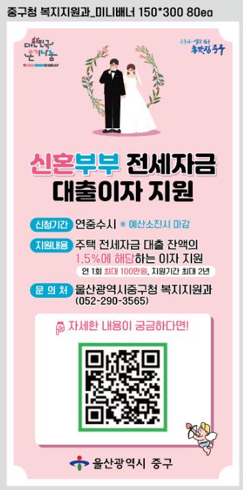 한편, 중구는 지원의 폭을 넓히기 위해 올해 하반기부터 신혼부부 주택 전세자금 대출이자 지원 신청 방식을 기존 상·하반기 연 2회 신청에서 연중 수시 신청으로 변경했다.