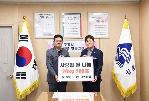 [뉴스서울] 부산 동래구는 지난달 27일 ㈜대광건영(대표 김남중)으로부터 백미 20kg 200포(940만 원 상당)를 기탁받았다고 밝혔다.