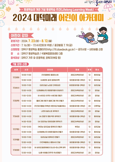 석봉복합문화센터 3층에 위치한 대덕구 평생학습관은 8월부터 운영되는 정규 강좌에 들어가기에 앞서, 어린이들에게 다양한 평생학습의 기회를 접할 수 있도록 오는 23일부터 30일까지 ‘대덕미래 어린이 아카데미’를 진행한다.