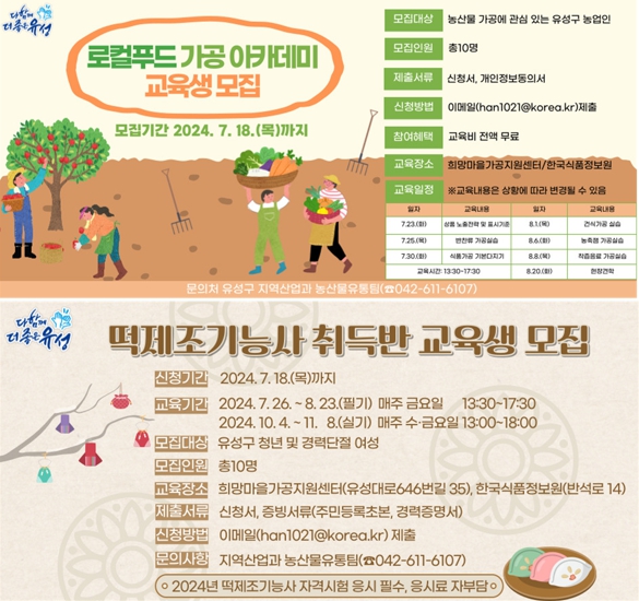 [뉴스서울] 대전 유성구가 18일까지‘2024년 로컬푸드 가공·교육’교육생을 모집한다.