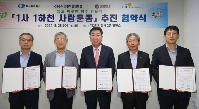 [뉴스서울] 청주시는 28일 제2임시청사 발전소에서 청주상공회의소, ㈔충북경제포럼, ㈜아이앤에스, LH한국토지주택공사 충북지역본부 등 4개 기관 및 기업과 ‘1사 1하천 사랑운동’추진을 위한 협약을 체결했다.